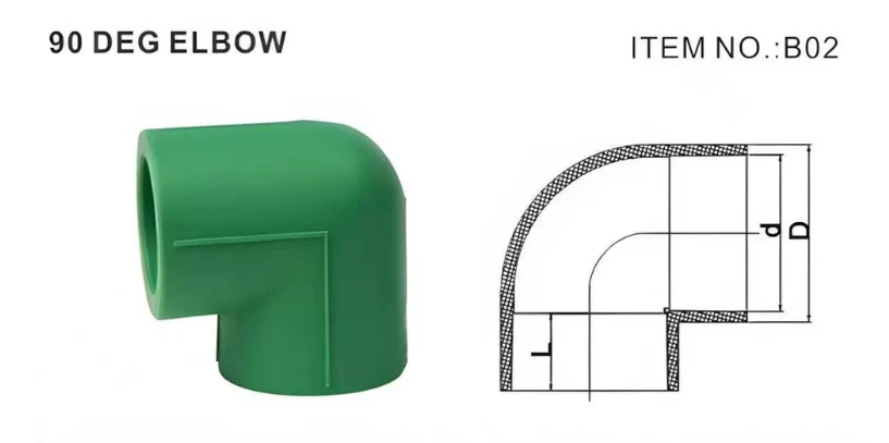 Polypropeenin satunnaiskopolymeerissä 90 asteen kyynärpäät ovat yhtä muotoisia ja 90 asteen kulma. Valmistettu PP - R -materiaalista käyttämällä kuumaa painetta ja injektiotekniikkaa, tässä kyynärpäässä on pyöreä pääkoodi. Siinä on erinomaiset ominaisuudet, kuten korroosionkestävyys ja helppo kokoonpano. Kokojen, jotka vaihtelevat välillä 20–160 mm, kyynärpää mahdollistaa sen kokonaispituuden mukauttamisen. Siinä on pistorasian fuusio- ja hitsausliitännät, ja se pystyy kestämään työlämpötiloja välillä -14ºC -95ºC, paineen arvioinnissa PN10: ssä ja PN20: ssa. Tuote on sertifioitu DIN-, BS- ja GB -standardeille, on vihreä ja se on pakattu pakkauslaatikoille. Tarjoamme myös OEM- ja ODM -räätälöintipalveluita.
